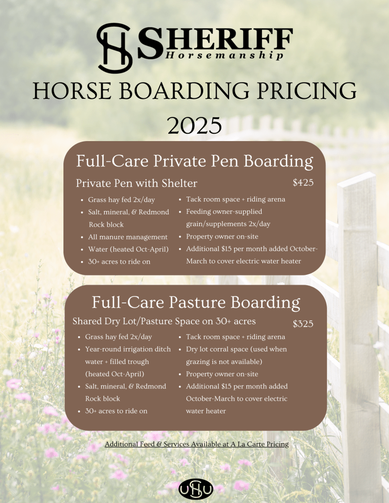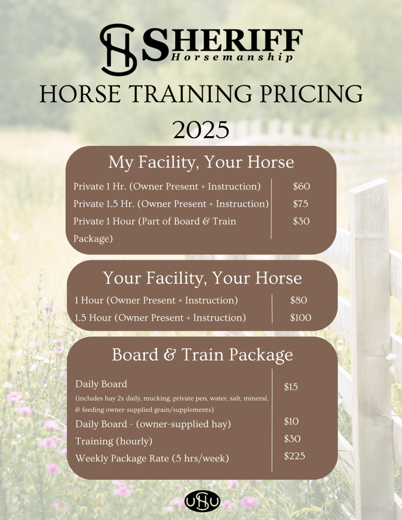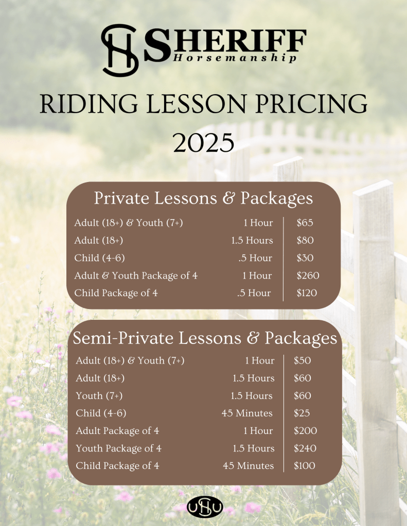 Please see my rates and pricing below. For more information, email me at rebecca@sheriffhorsemanship.com